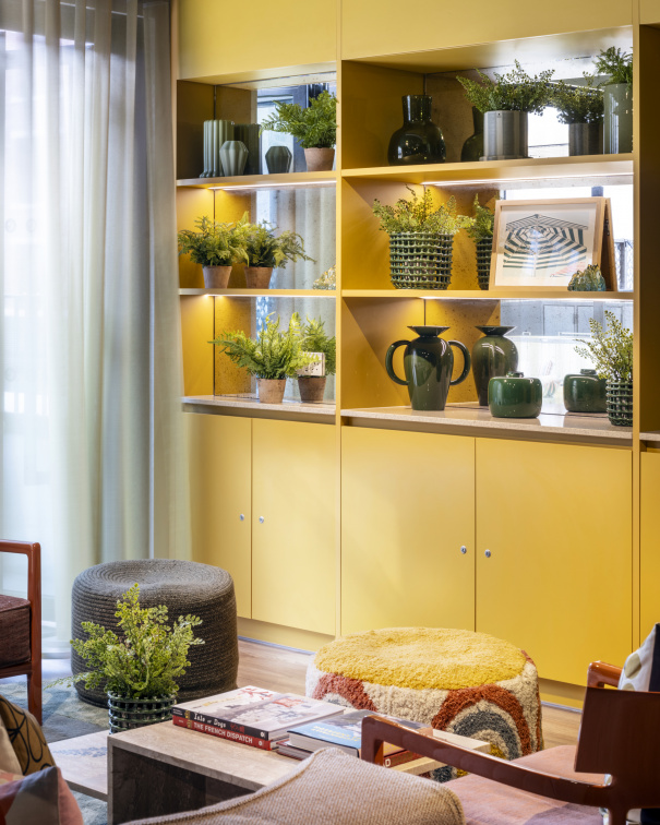 A bold palette replaces neutrality with expressive colour and texture, shaping rooms that balance playfulness with warmth. Symmetry and softness coexist, structured grids are softened with ribbed corduroy fabric, arched details and panelled walls. Deep burgundy, soft pinks, bright yellow, green and blue tones form the basis of a layered narrative that evokes both nostalgia and energy. Every room is composed like a frame, layered in tone, texture, and mood. The interiors aim to be immersive yet functional, playful yet precise.