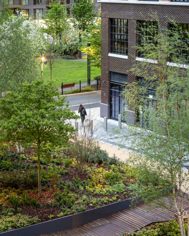 Planting delineates spaces and softens edges, with trees selected for seasonal interest and shade. Beds combine ornamental and shade-tolerant species with understorey mixes that support biodiversity. Several pedestrian routes cross the square improving wider access through the neighbourhood and creating dramatic long views across Canary Wharf. Rooftop terraces at 3 & 15 West Lane provide further communal space with views, raised planters, and integrated lighting.