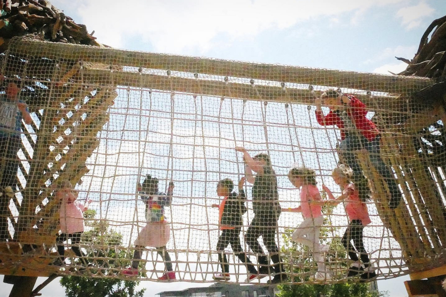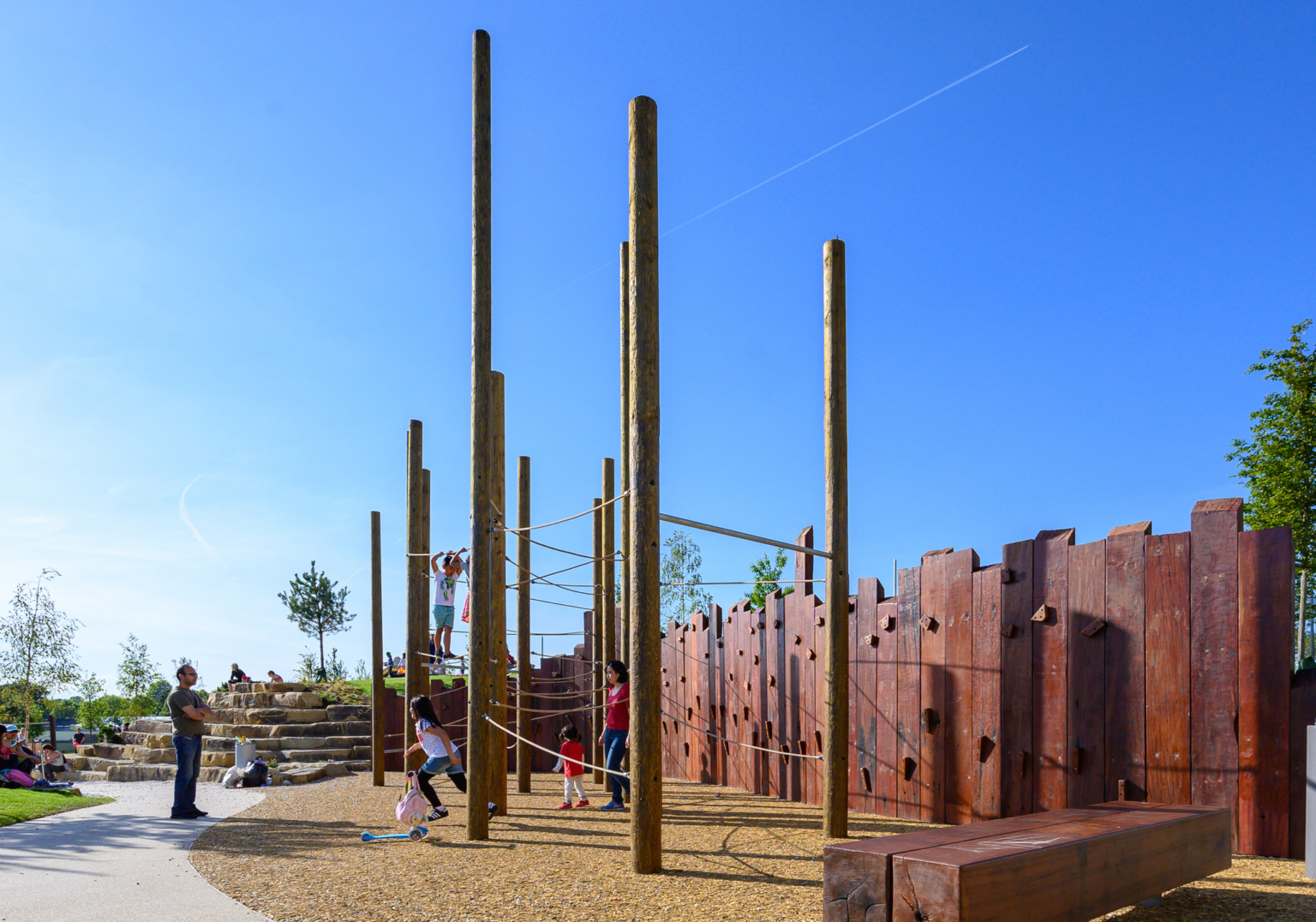 At the source of the chalk stream we have created a 3,000m3 wild play space creating a biophilic experience for ages 0 to 100. Limestone outcrops and climbing walls enclose the space and bespoke natural play towers create a dramatic focus the space, materials used in the construction have been repurposed and upcycled from standing deadwood trees, air preserved and reused as climbing frames to greenheart groynes pulled out redundant Thames jetties to be used as climbing walls and benches.