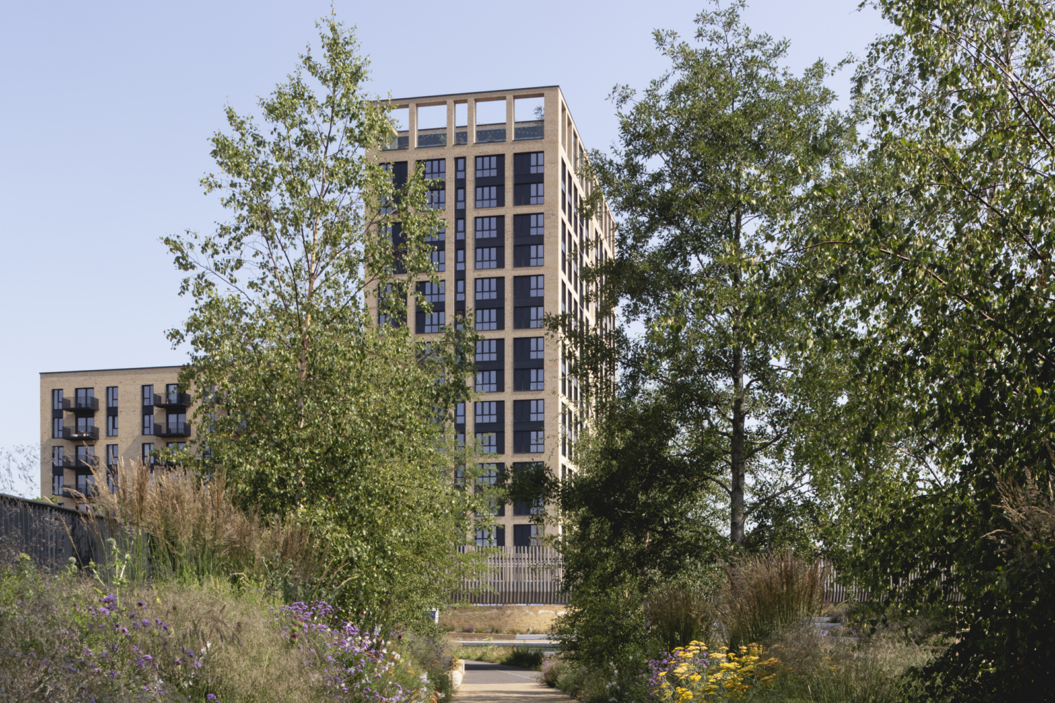 The project restores canalside wildlife corridors by establishing a native waterside scheme with riparian planting, pioneering trees and species rich meadows. This character is drawn into the centre of the development and carefully blended with more ornamental wildlife attracting species to create a structured transition with a prolonged flowering period, winter interest and high level of ecological value. Over 100 trees have been established using predominantly native species providing important habitat and mitigating the urban heat island affect through their canopy cover.