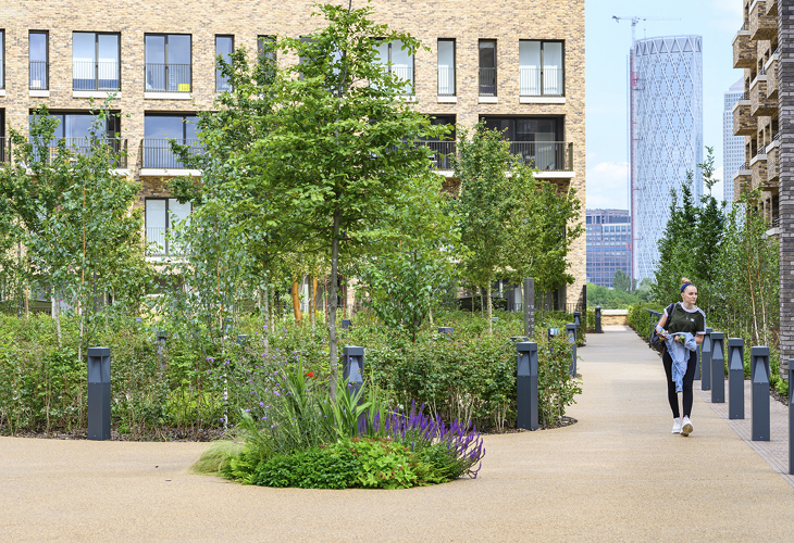 The podium was designed early on to facilitate large shared rooting volumes below the surface and fully permeable paving throughout. There are no raised planters or edges. This has created a verdant scheme that can mature and flourish in conditions that are as close to a natural environment as possible.