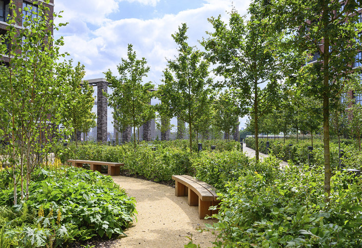 The Woodland Garden offers a 3000sqm verdant green space in an urban setting, on the third floor above the large Decathlon Store. Four buildings form the perimeter of the garden and frame views over the city skyline towards Canary Wharf and over the Canada Water Basin. The garden is part of the journey for residents as they will enter via the main lobby at ground floor, go to the third floor and then walk through the garden to reach their block. This increases the opportunities for residents to meet neighbours from other blocks and creates a pleasant arrivals sequence.