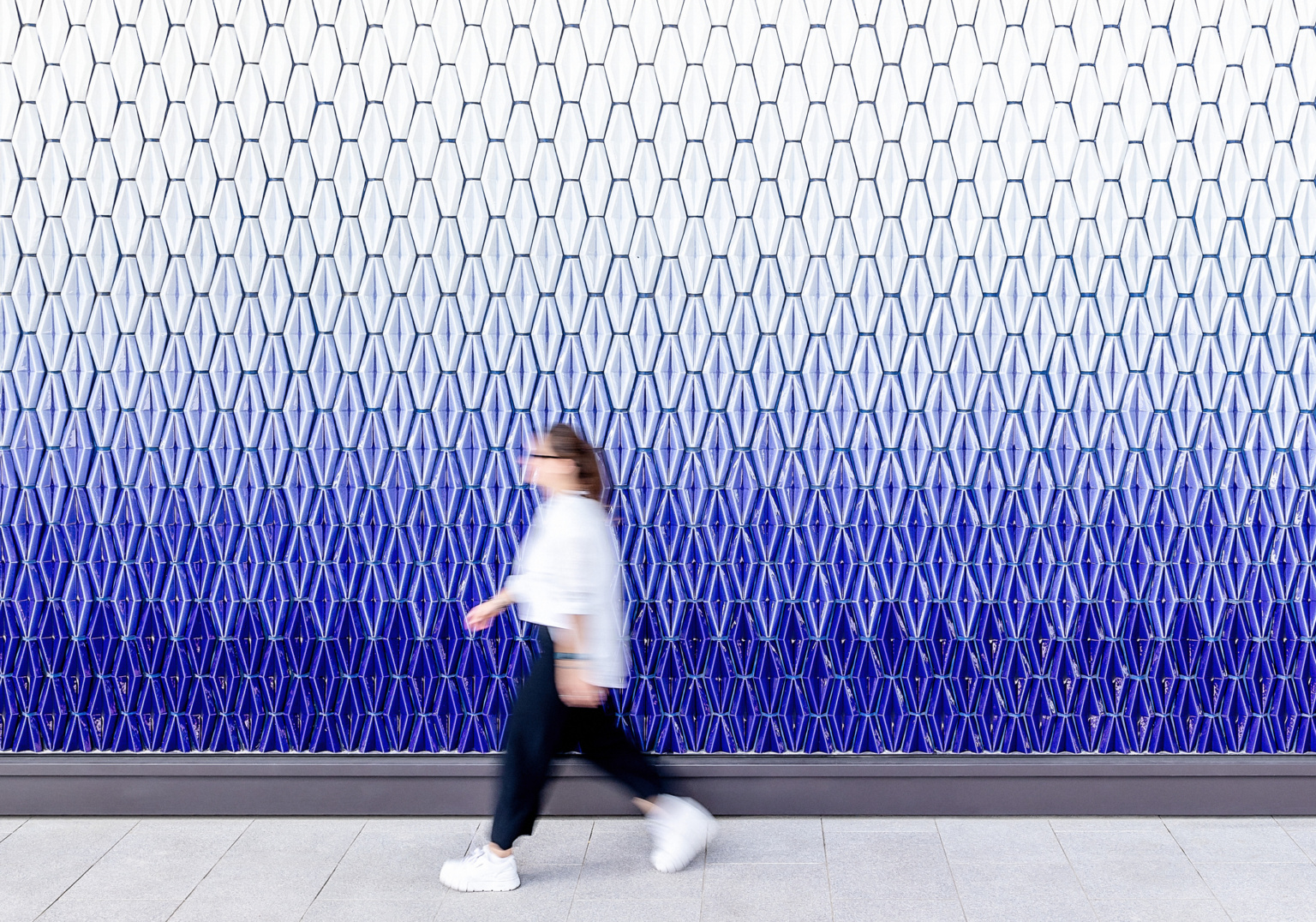 Looking ahead, College Road’s colonnade will connect to the emerging cultural quarter. HTA collaborated with artist Adam Nathaniel Furman to wrap seven 19-meter-high columns in slip-cast porcelain tiles with a graduated blue glaze, creating an uplifting new landscaped route.