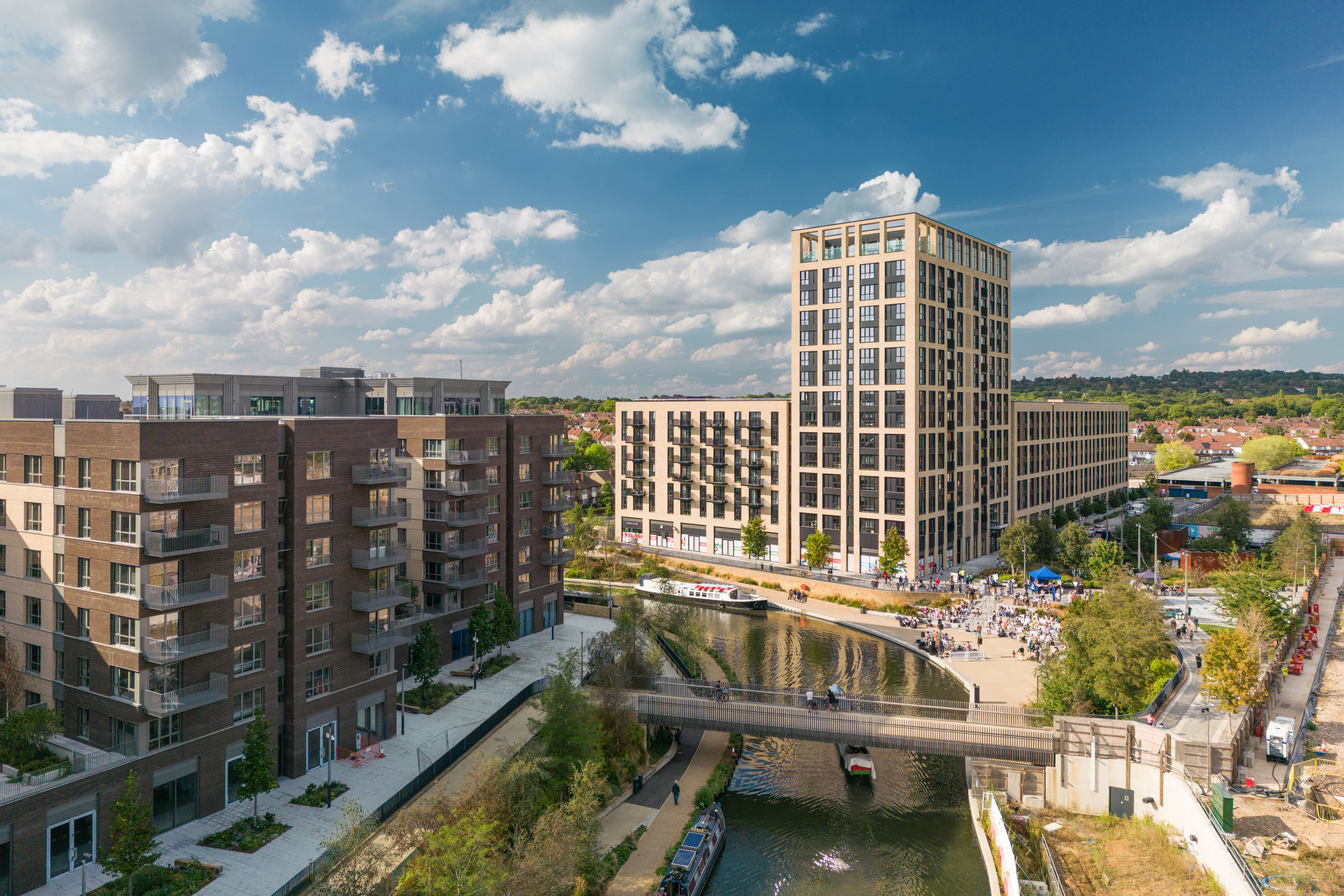 HTA’s masterplan for Greenford Quay in Ealing has transformed formerly private derelict industrial land adjacent to the Grand Union Canal into a beautiful new public space with revitalised canal frontage, overlooked by elegant buildings and low carbon homes. The mixed-use scheme of 2,118 homes will be 75% build to rent with additional private sale and affordable tenures, delivered across seven residential buildings. The ground floor levels of the buildings are given over entirely to various commercial uses to bring employment to the area and activate the streets, the buildings and the community.
