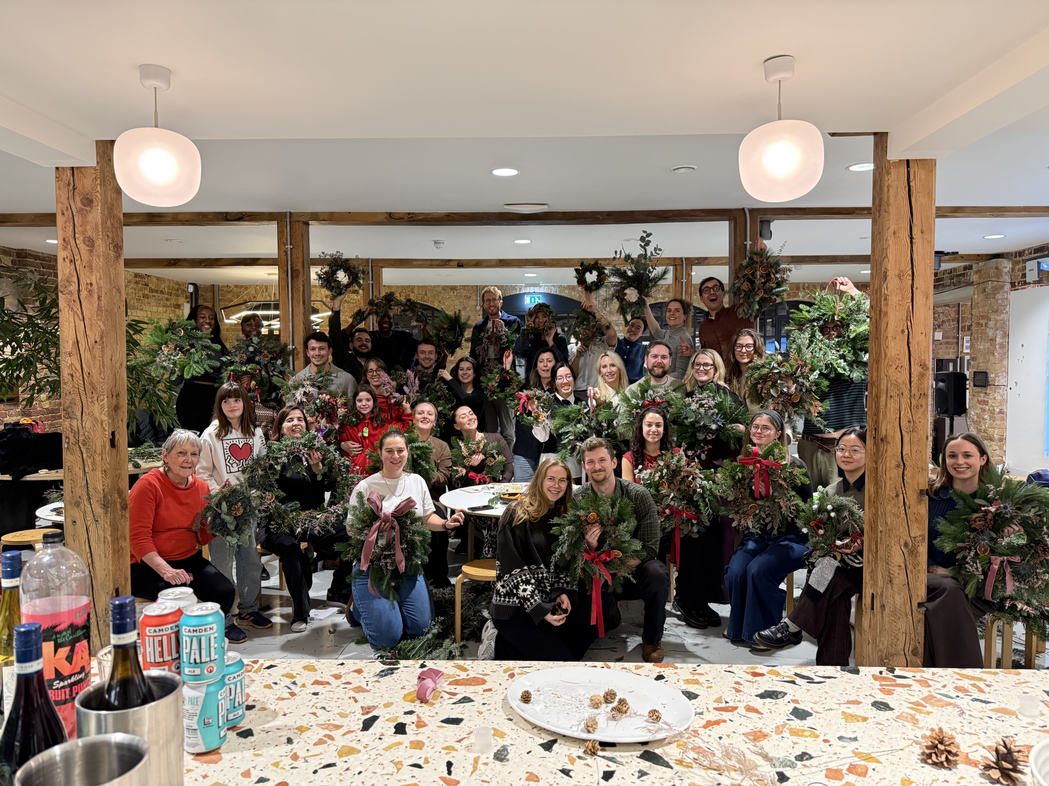 With foliage fresh from New Covent Garden Flower Market, the team learnt how to build and decorate festive wreaths over a glass of mulled wine.