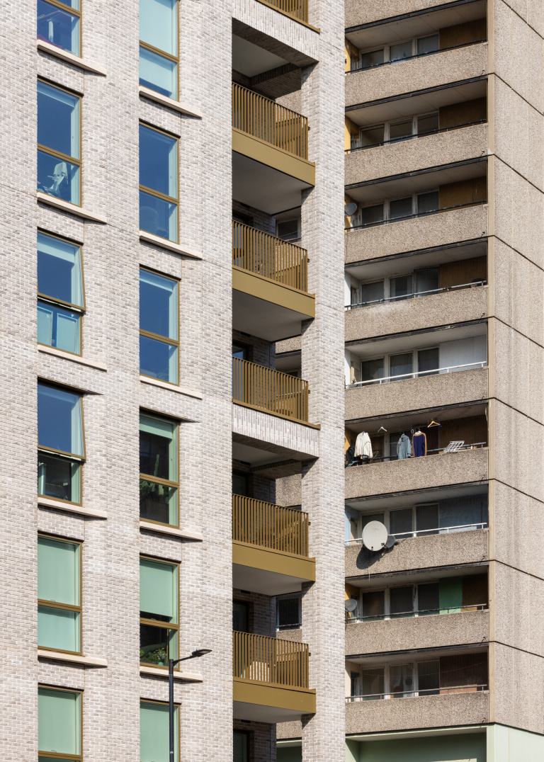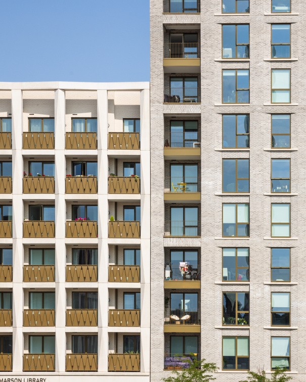 Two distinct buildings frame Aylesbury Square and are arranged to define movement through the site while establishing a strong sense of enclosure around this new civic space. The massing strategy responds directly to its surroundings: the taller, 15-storey block on Thurlow Street creates a visible marker from the wider area, while the buildings step down in height towards the adjacent conservation zone. This careful modulation ensures the development sits comfortably within its urban context.