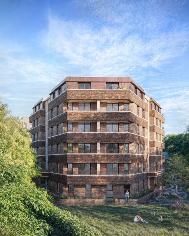 Two terraces of three-storey houses line the western edge, providing a softer interface with the neighbouring residential streets. Materials and detailing draw from the local civic and domestic character, with brickwork and stone elements creating visual continuity. The architecture responds directly to the site’s constraints, including the Ancient Woodland buffer and SINC designation, ensuring a sensitive balance of density, heritage and ecological priorities.