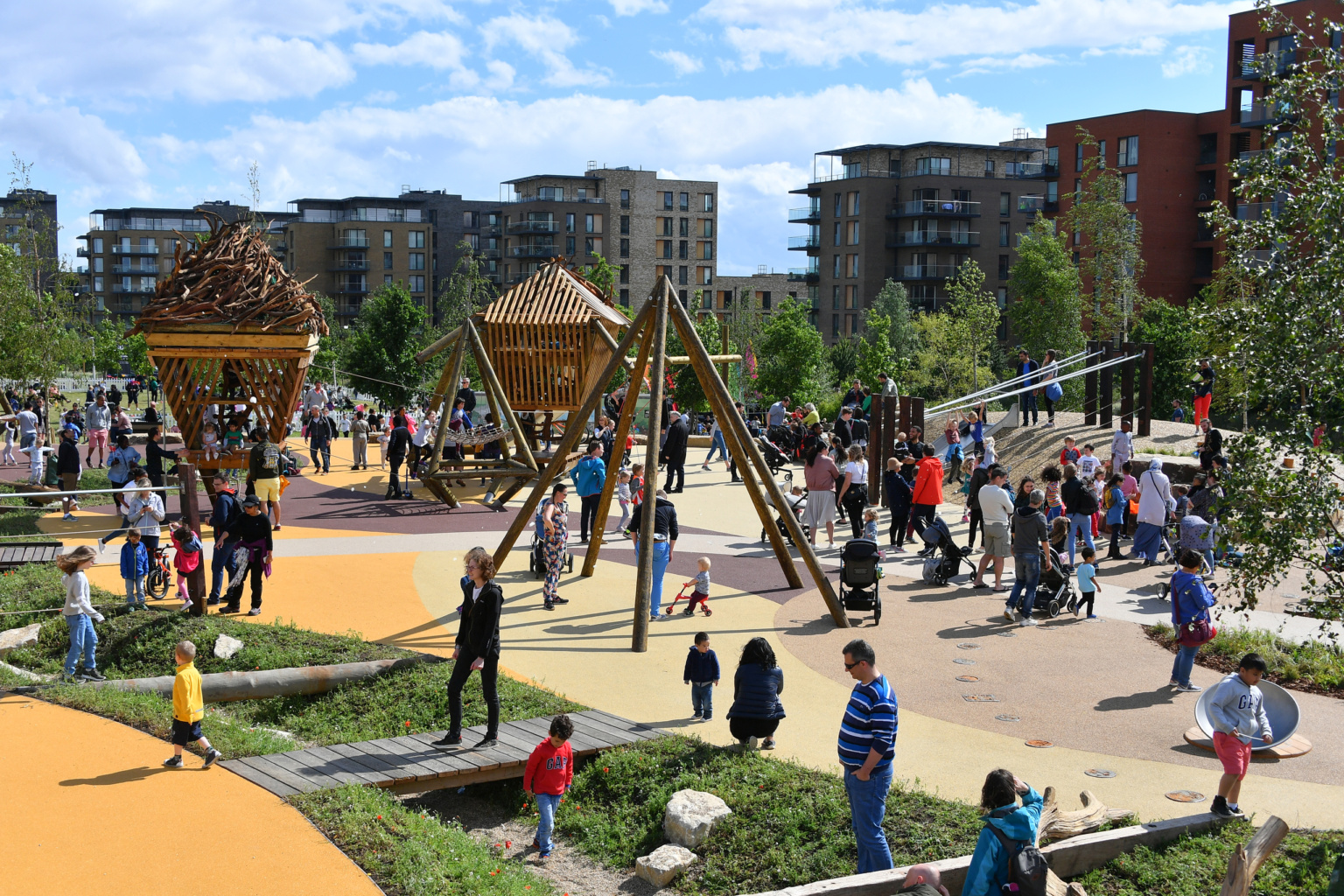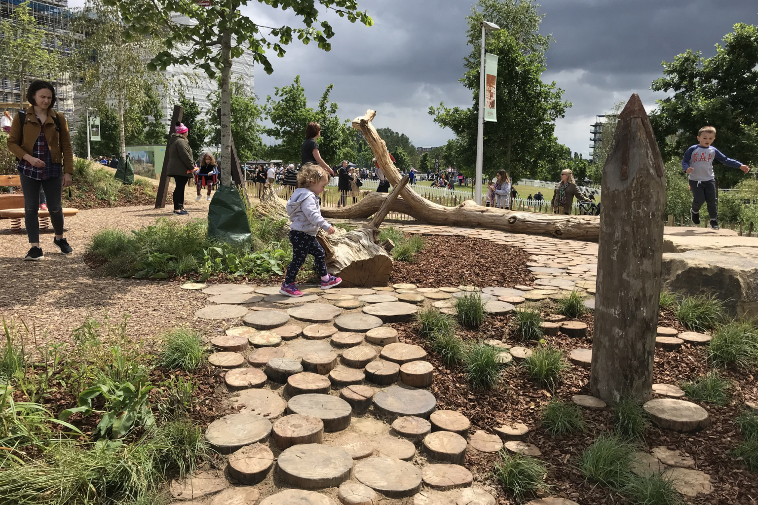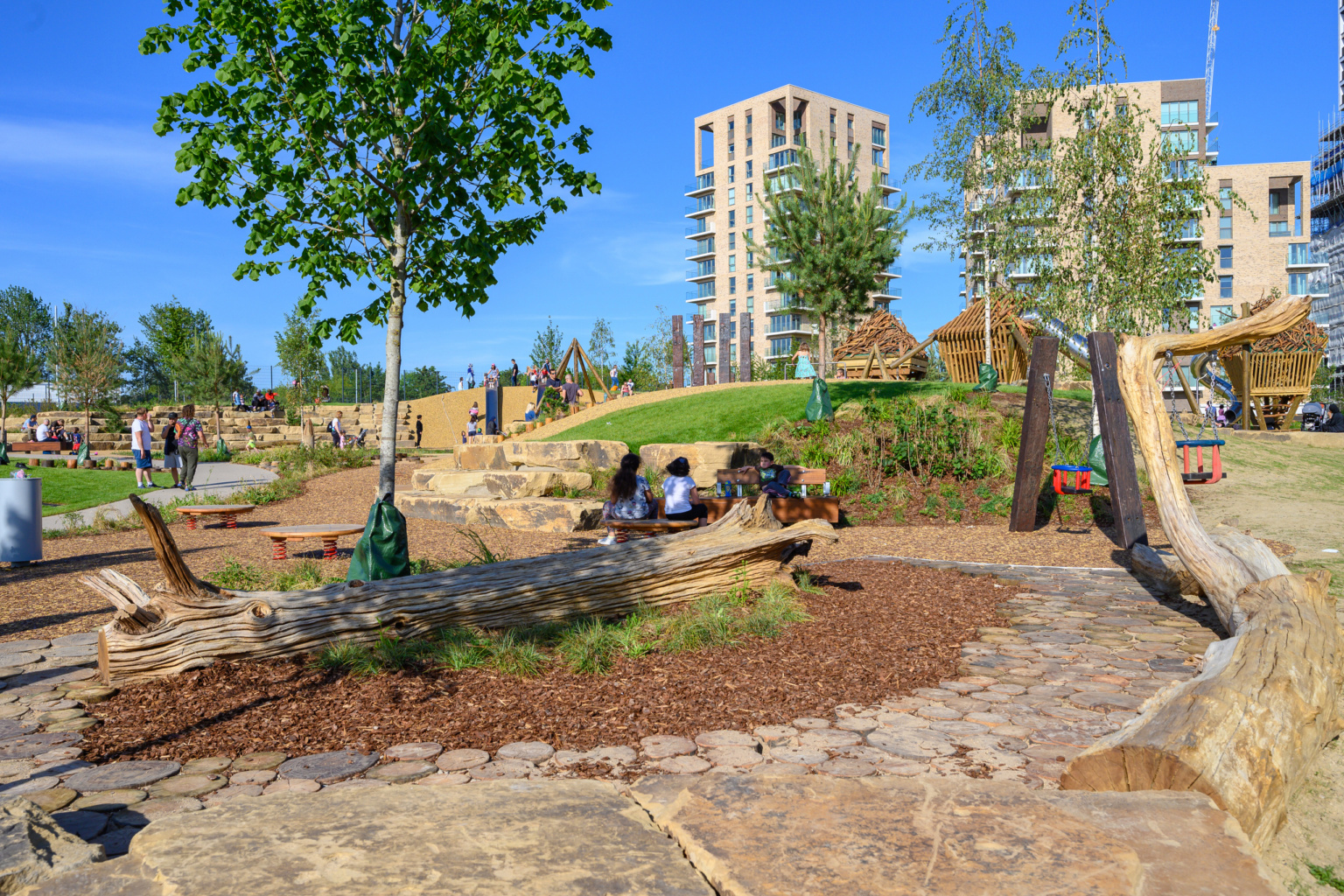 Construction waste from the development was used to create new mounds that serve as play features, whilst supporting the other play structures. Timber groynes were sourced from the Thames and repurposed in the play structures. Kiln dried raw timber was used to clad two impressive structures inspired by tree houses. The evolving process was agreed with the Royal Borough of Greenwich’s play inspector to ensure opportunity for play was balanced with safety.