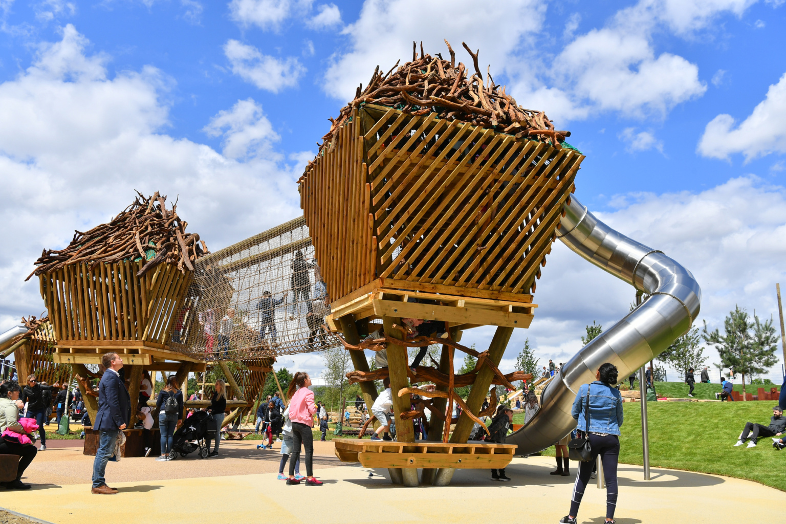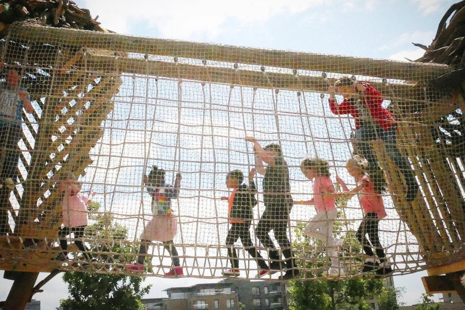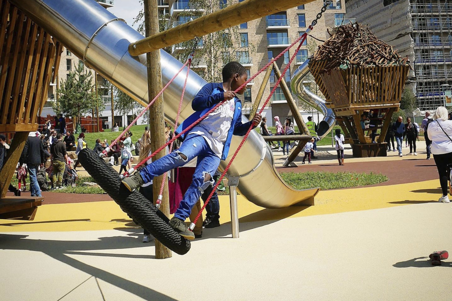 Construction waste from the development was used to create new mounds that serve as play features, whilst supporting the other play structures. Timber groynes were sourced from the Thames and repurposed in the play structures. Kiln dried raw timber was used to clad two impressive structures inspired by tree houses. The evolving process was agreed with the Royal Borough of Greenwich’s play inspector to ensure opportunity for play was balanced with safety.