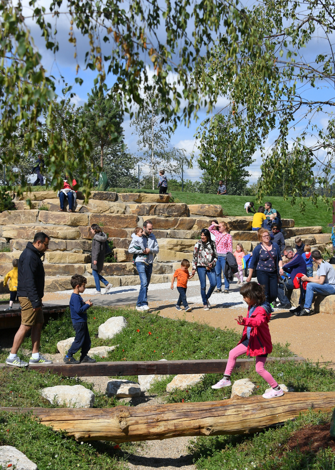 We enabled the ponds to form the backbone of the landscape approach by introducing a path alongside them. This provides a fully accessible route through the park, connecting the existing bodies of water, providing play on the way, and inviting the public to discover and interact with the natural environment. Seating has been introduced along the boardwalk and on the bridges across the pond which connect the park with the new homes encouraging people to stop and be in nature.