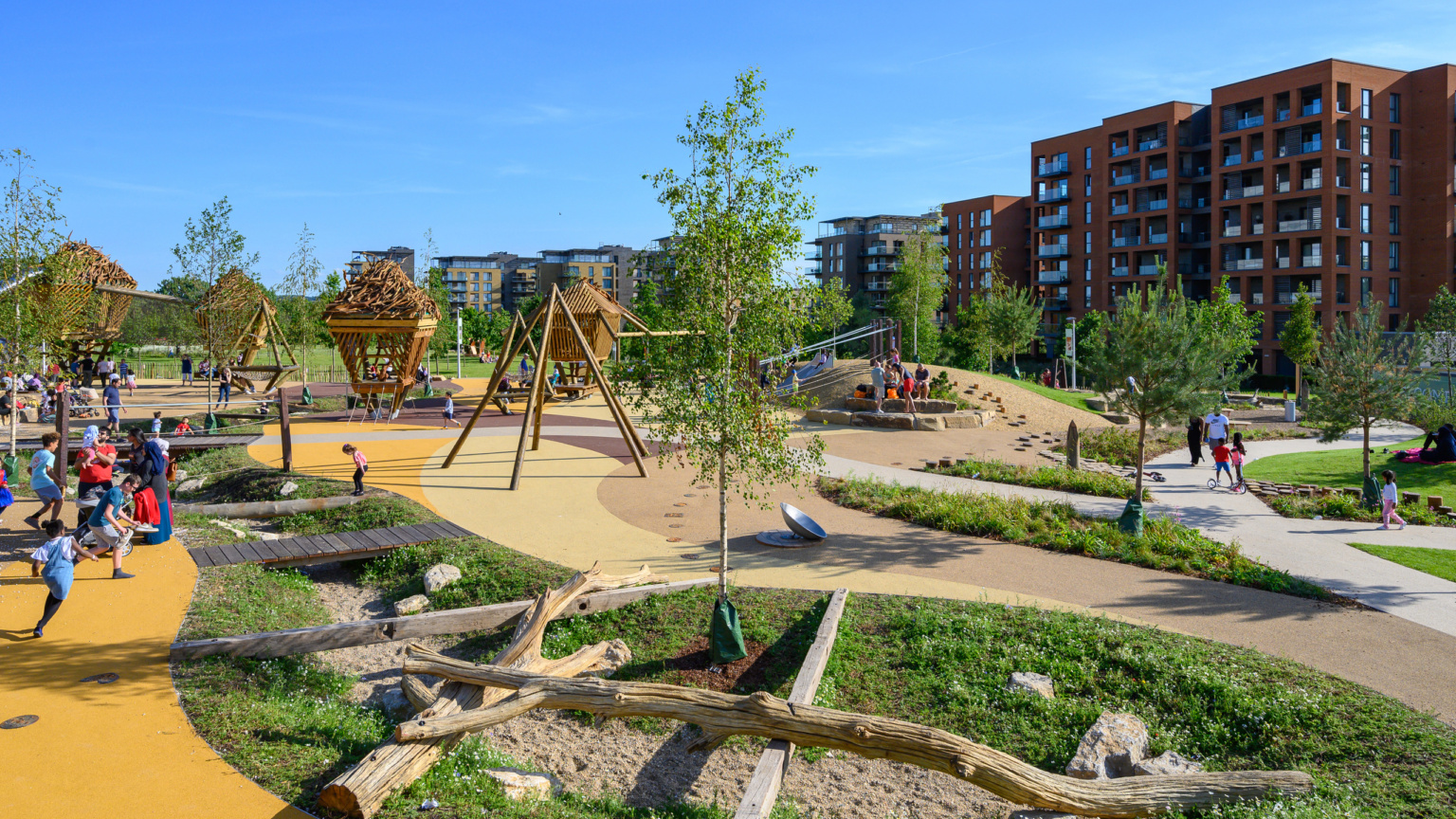 A large development like Kidbrooke Village deserves communal facilities. A critical part of this is children’s play. We planned to include a 3500sqm play space for a wide range of age groups at the north end of the park. We located the play space immediately next to the village centre, the train station and a new primary school that is part of the masterplan. This strategically situates the play space on the daily route for children on their way home from school. The park is located near the over 55s accommodation placing it site of people who are more likely to be at home during the day, increasing the passive surveillance and safety of the site and creating connections between Kidbrooke Village’s younger and older residents.