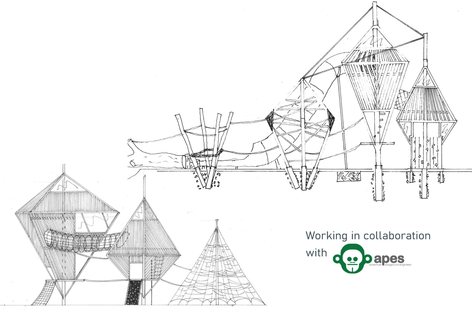 To deliver a world class play space we took the client to visit other fantastic playgrounds in the UK, allowing us to establish shared goals at the outset. We then worked through initial drawings with Adventure Playground Engineers (APES), a company that originated in the grassroots adventure playground movement, with a 20-year history designing and realising imaginative play spaces across the UK. APES used their knowledge of playground construction to realise our shared designs on site.