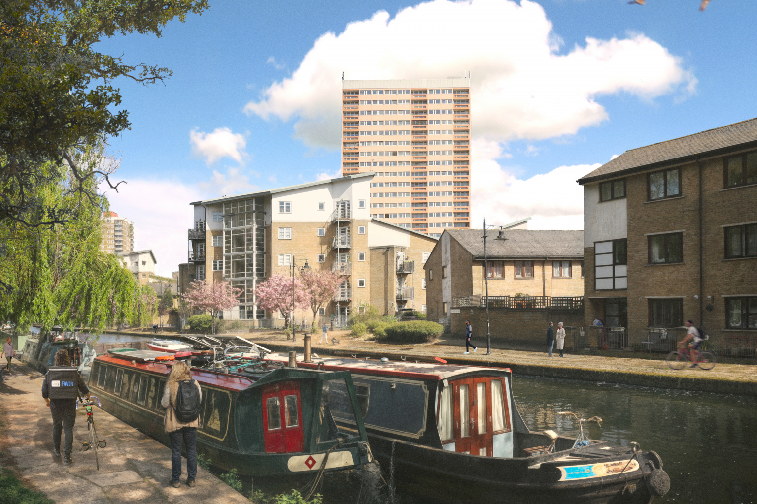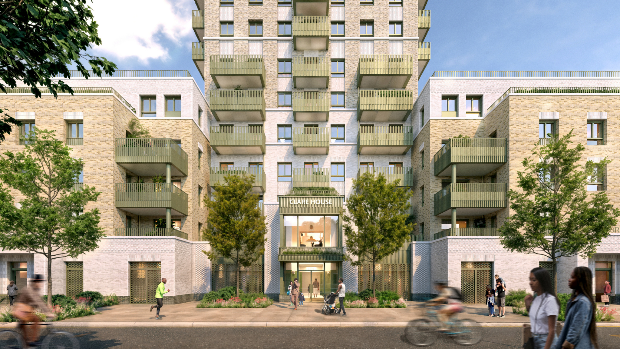 Clare House replaces a 1960s tower with 145 energy-efficient new homes, all for social rent. More than half are large, family-sized homes, and the architecture honours East London’s post-war modernist heritage.