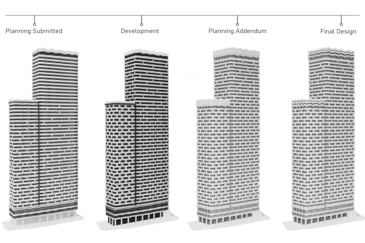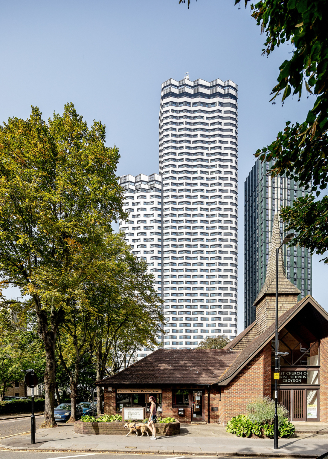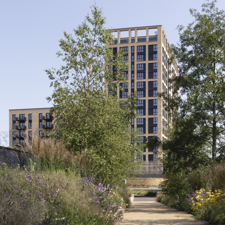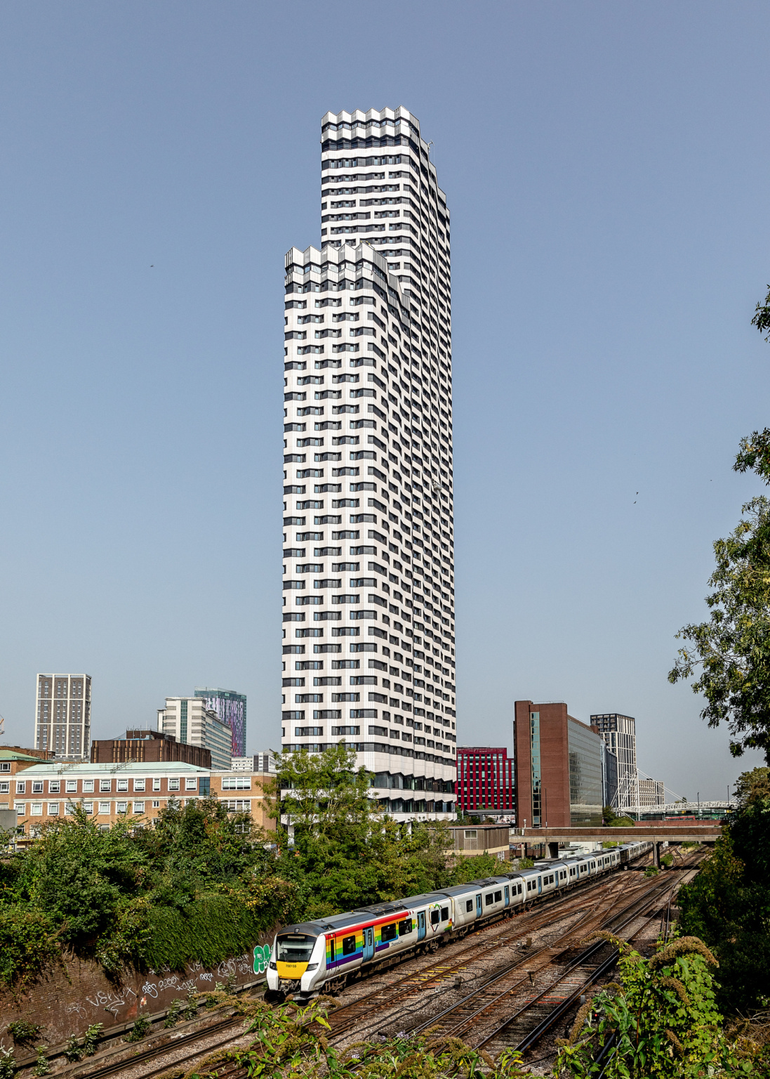In developing these typologies, a key element was the consideration of the width of the home. The aim was to design each home with optimal dimensions for a living room width instead of just a bedroom like historic co-living ‘rooms’ had done. The most common homes on each floor have a living space and kitchen by the window, with a separate bedroom. Larger homes are two rooms wide, offering discrete bedrooms with their windows and more generous living spaces. Finally, the ‘cosy’ homes combine the bedroom and living space around a bay window that maximizes daylight and views while delivering the most affordable homes. We worked closely with Tide and Outpost to develop the detailed design through full-size mock-ups that capture bespoke furnishings and storage, optimizing the space within each home. Every spare space is optimized, from fold-up beds to shelving that fills void spaces. In addition to the co-living element, the College Road tower delivers 120 affordable homes, 30% of the development by habitable rooms.