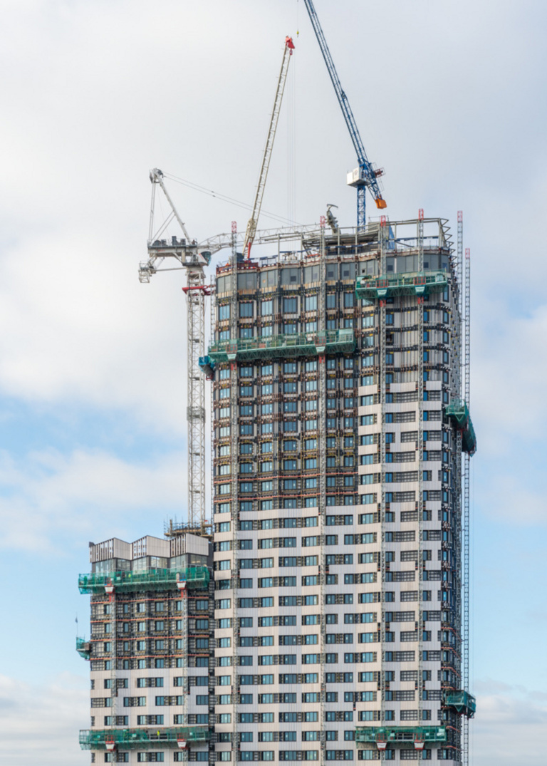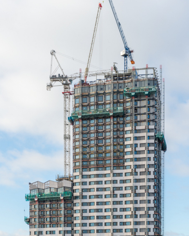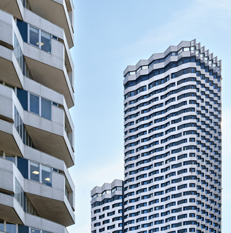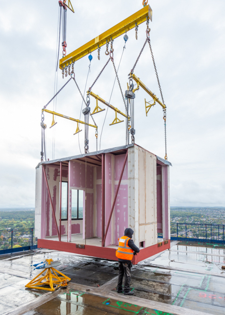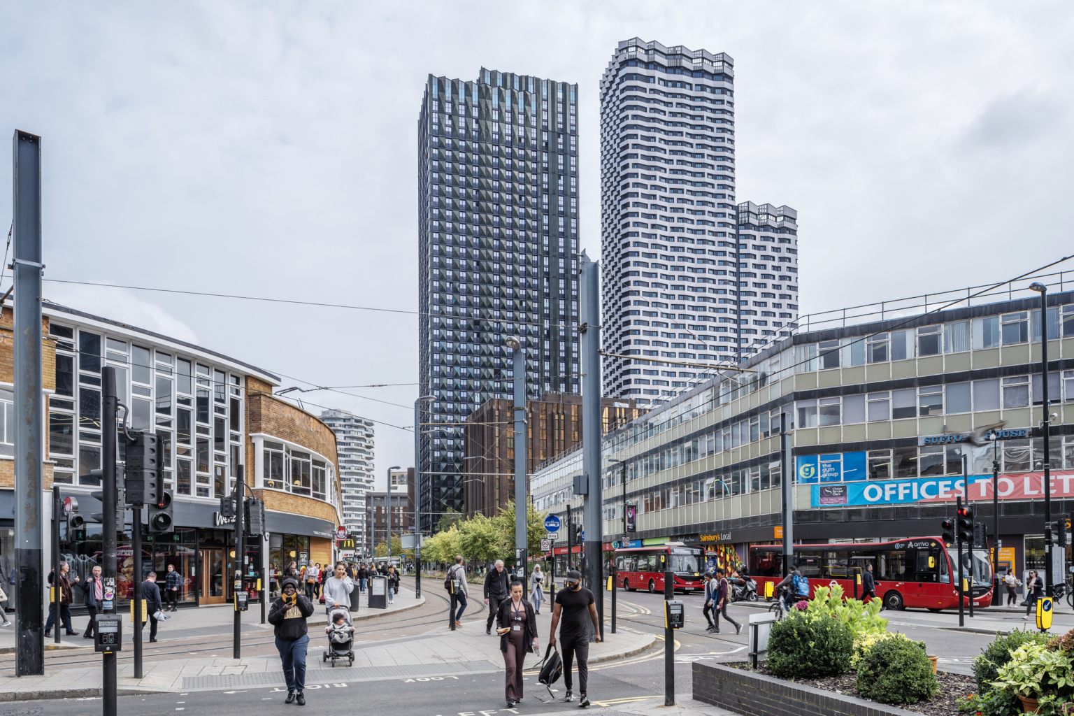 In developing these typologies, a key element was the consideration of the width of the home. The aim was to design each home with optimal dimensions for a living room width instead of just a bedroom like historic co-living ‘rooms’ had done. The most common homes on each floor have a living space and kitchen by the window, with a separate bedroom. Larger homes are two rooms wide, offering discrete bedrooms with their windows and more generous living spaces. Finally, the ‘cosy’ homes combine the bedroom and living space around a bay window that maximizes daylight and views while delivering the most affordable homes. We worked closely with Tide and Outpost to develop the detailed design through full-size mock-ups that capture bespoke furnishings and storage, optimizing the space within each home. Every spare space is optimized, from fold-up beds to shelving that fills void spaces. In addition to the co-living element, the College Road tower delivers 120 affordable homes, 30% of the development by habitable rooms.