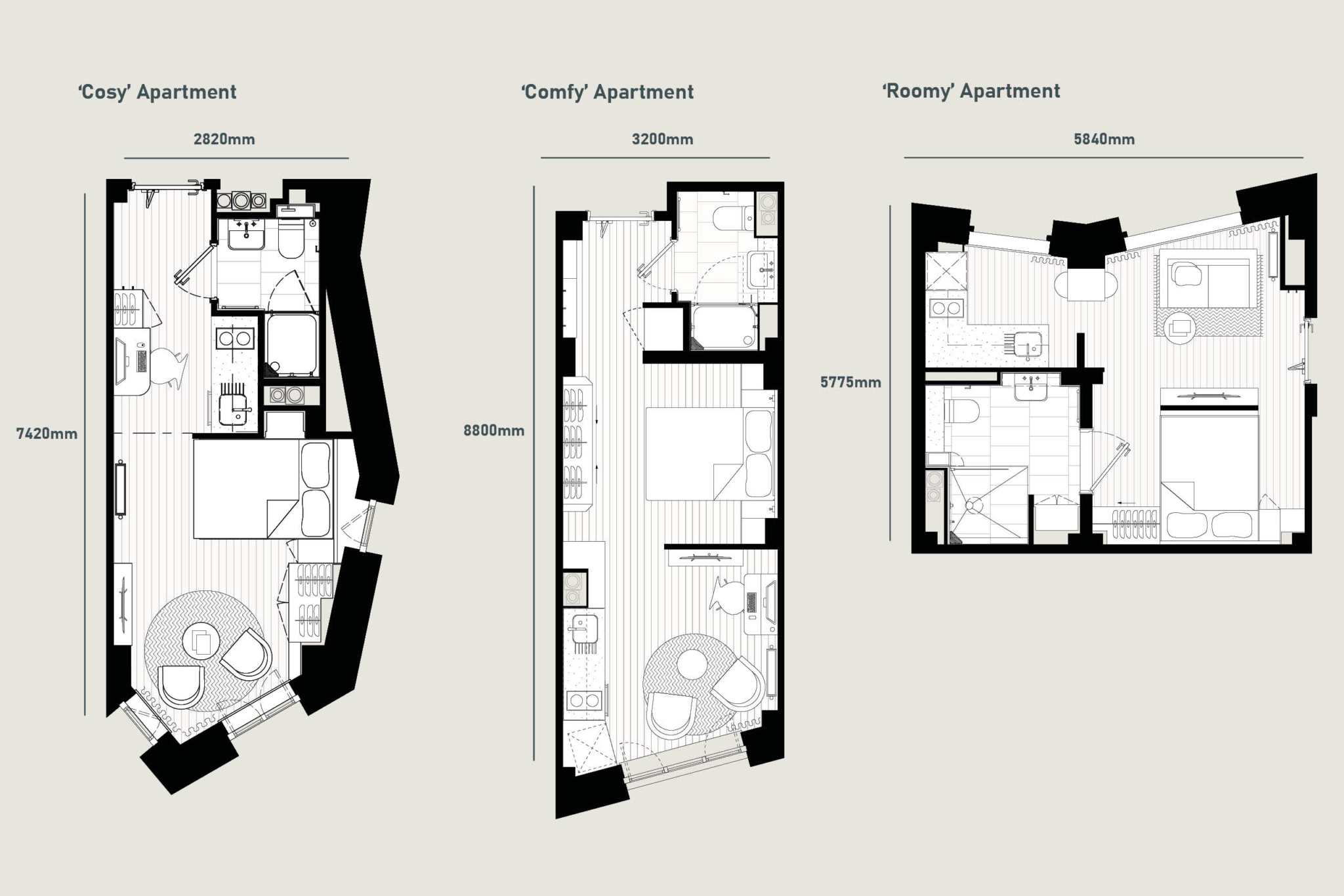 HTA’s interiors team delivered apartments designed around three basic typologies with generous layouts, including a living space and kitchenette. HTA worked with developer Tide and owner and operator Outpost Management to develop these detailed designs, creating full-sized mockups with bespoke furnishings and storage to optimise each home. The homes play a vital role in London’s housing market, bridging the gap between small, rented accommodation and larger houses. In addition, co-living can address issues of urban loneliness, offering the best mix of private and communal life.