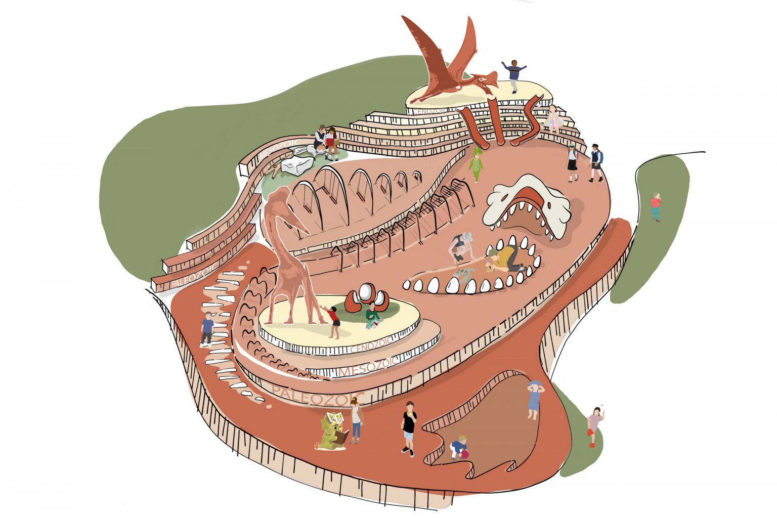 The play area acts as an immersive paleontological dig site, where layers of geology, fossils and prehistoric creatures are revealed. Large play structures, inspired by the iconic dinosaur forms, emerge from the landscape to spark curiosity, and encourage imaginative play and discovery.