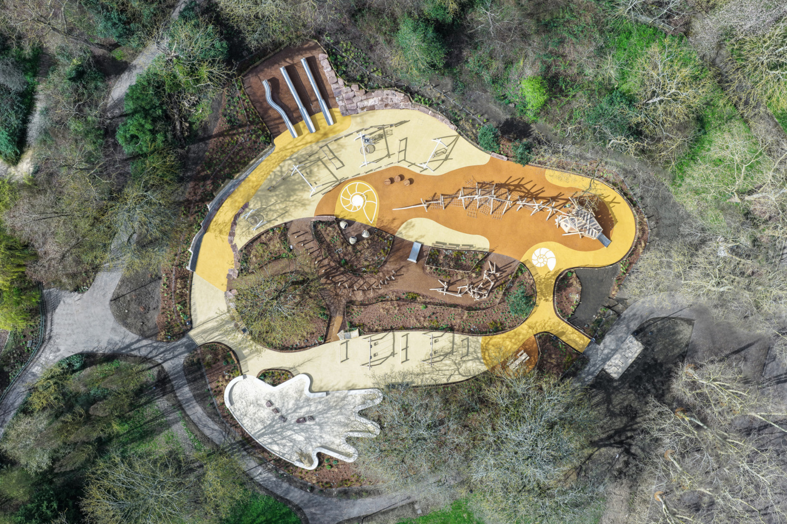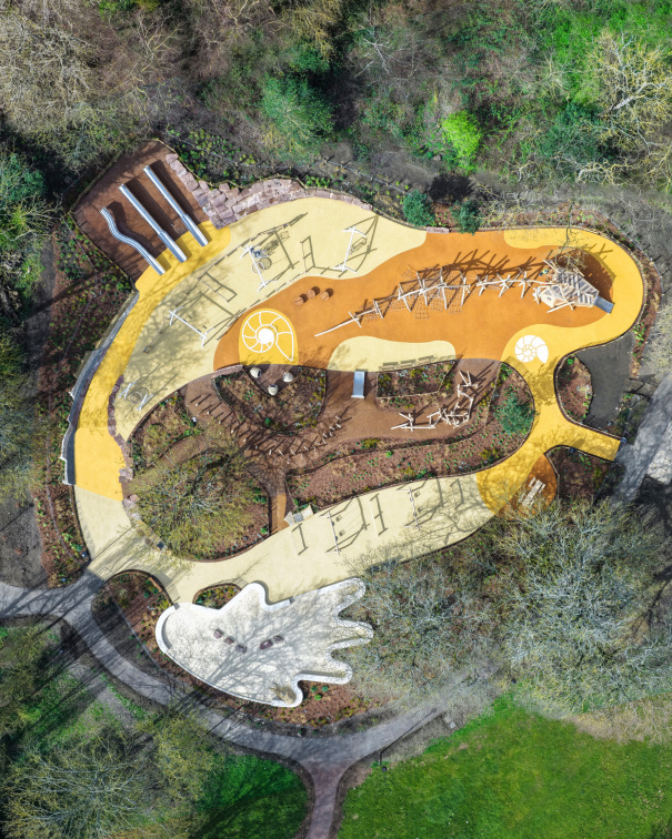 Inspired from the Victorian Geological Illustrations within the park, a wall of layered rocks and climbable boulders invites children to explore geology in a playful, tactile way. Surrounding the space, ‘paleo-planting’, drawing on prehistoric plant species, frames the play area and offers opportunities to learn about plant evolution and environmental change through time.