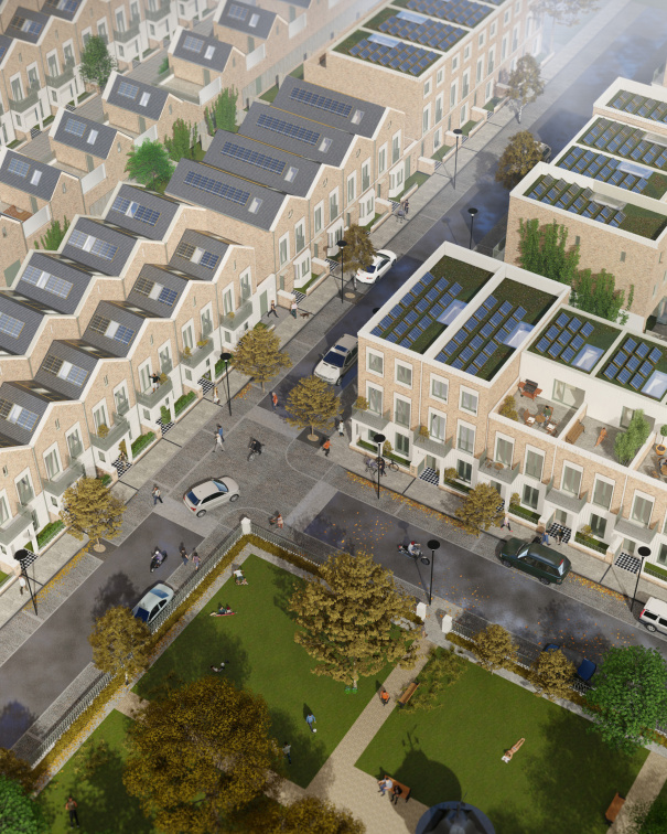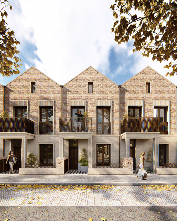 The Sunday Times British Homes Awards challenged us to reinvent the terrace in a new genre, fit for our time. Inspired by the beloved homes of the Georgian and Victorian periods, yet designed for modern living, our design celebrates 21st-century construction and digital craftsmanship through precision-engineered homes that allow bespoke personalisation. Homeowners can choose from 3D-printed decorative reliefs, stone surrounds, laser-cut details, metalwork, and intricately carved CNC internal wood paneling to create a home that reflects their personality. Beautiful streets are unified by shared details, proportions, and materials. Subtle variations from terrace to terrace, such as gables, parapets, stone porches, and bay windows, enhance the echoes of Britain’s historic terraces and provide relief, interest, and rhythm to the streetscape.