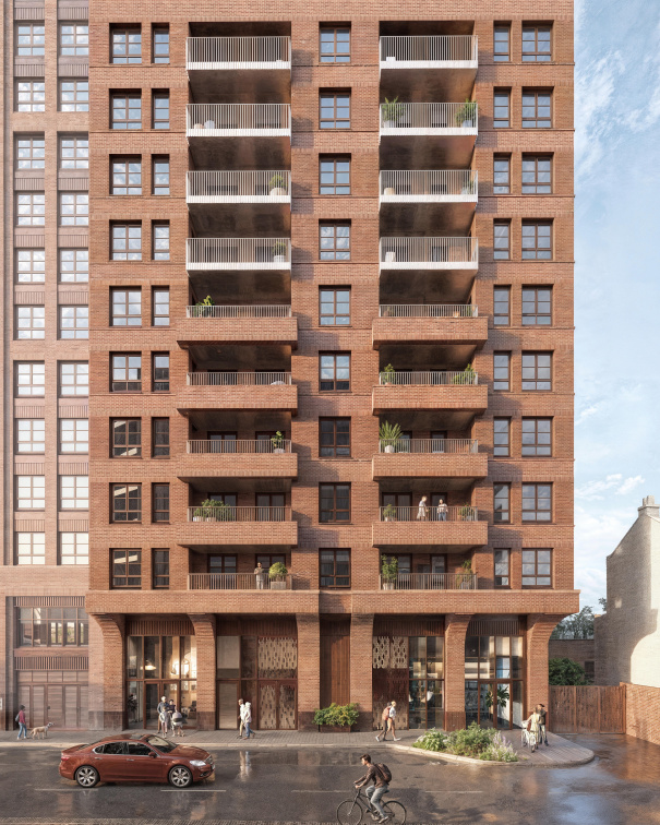 The student tower anchors the site with a slender vertical profile rising to 27 storeys. Its brick-clad elevations are defined by a bold fenestration grid, with a strong brick gable and decorative glazed brick detailing at the base. The affordable housing shoulder block steps up to 13 storeys toward the railway, using horizontal brick banding and recessed balconies to articulate scale and rhythm. The industrial unit adopts a more utilitarian expression, contributing to the site’s character while supporting local employment.