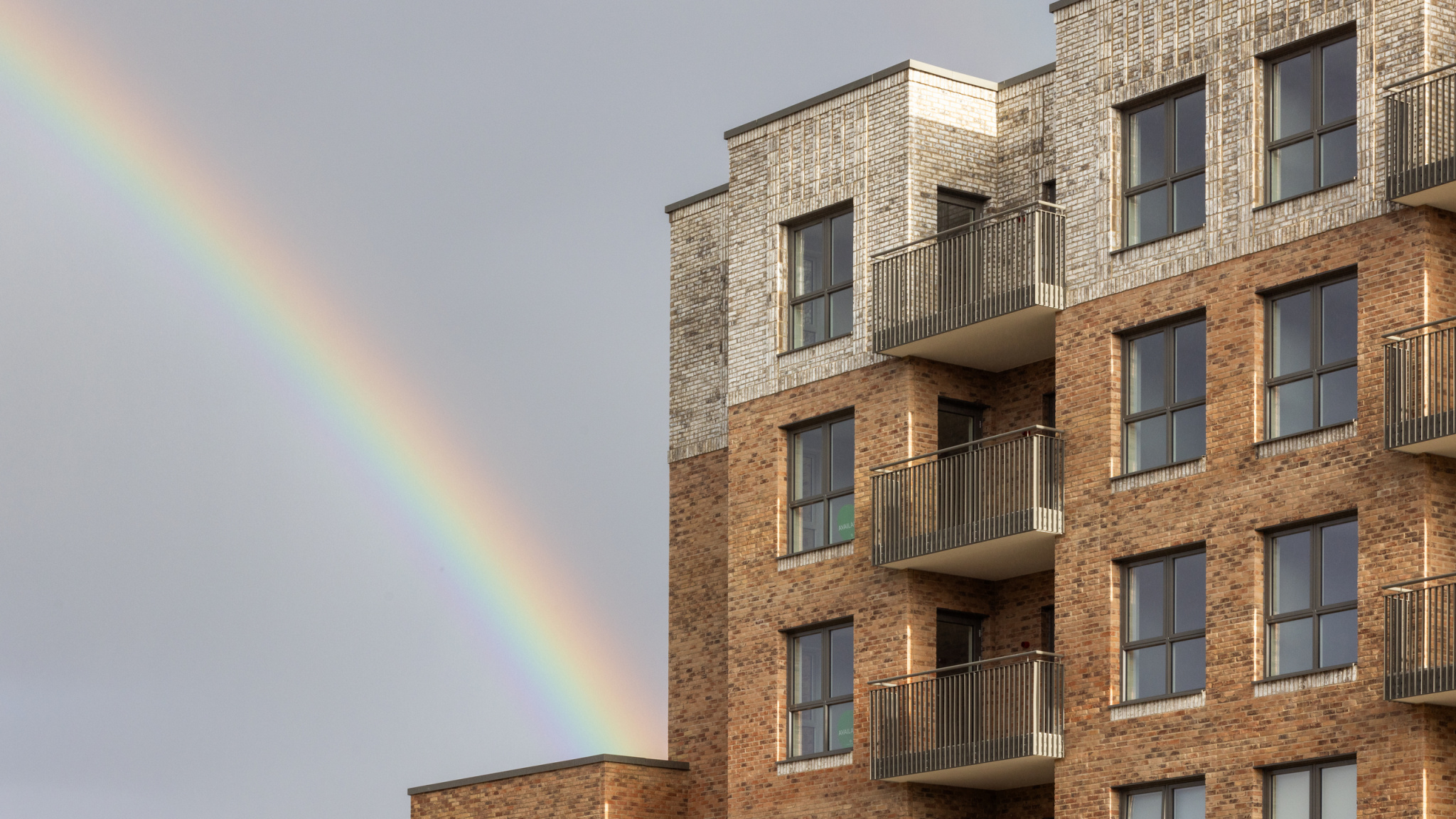 Ground-floor maisonettes and generous communal entrances reinforce active frontages, improving natural surveillance and fostering neighbourhood connections. Architectural details including white brick porticos, brick rustication at street level, and stepped-back crown storeys, create a clear facade hierarchy. The building palette blends contrasting brick tones with crisp white detailing to enhance articulation and depth.