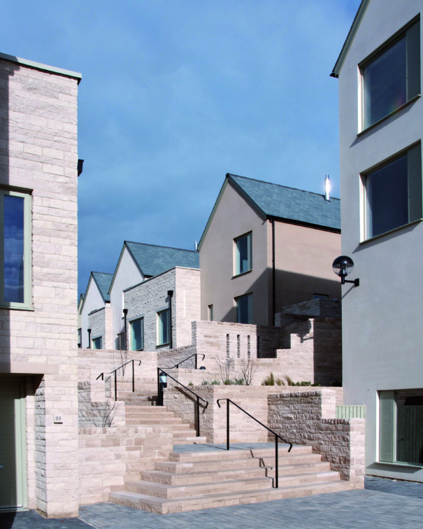 Natural Portland stone, purchased in bulk at the very bottom of the housing market, has been extensively used on elevations and within the public realm. The large change in levels across parts of the site have also been used to develop attractive and arguably ‘quirky’ split level homes that make the very best of the sea views over Portland Harbour and the English Channel.