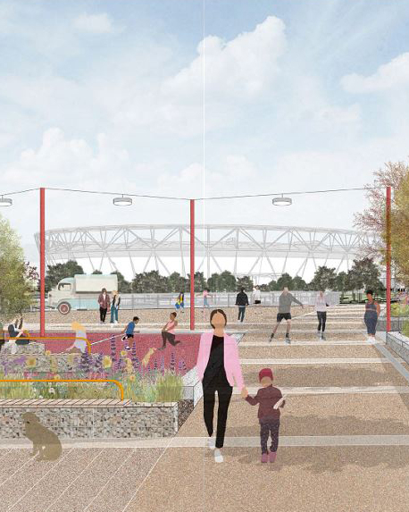 The proposals reimagine a formerly underused site as a generous, active and inclusive spine for walking, cycling, socialising and events. A biodiversity-led approach introduced a 40% increase in green infrastructure, with enhanced planting, lighting, wayfinding, and dwell spaces that support a more welcoming and accessible experience. Existing assets like the Paralympic Orchard were retained and celebrated within the new design.