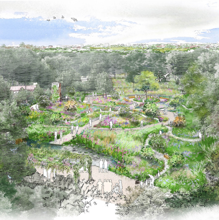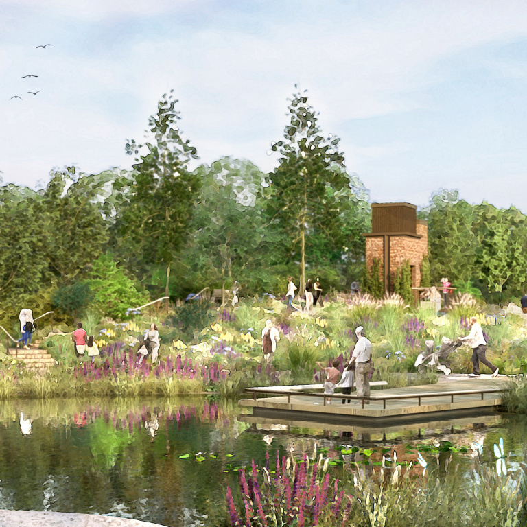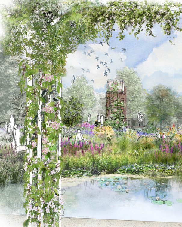 A disused water tower will be transformed into an accessible viewing platform with panoramic views of the garden and its surroundings. The tower will provide habitats for birds, bats, and invertebrates, serving as a unique educational tool for visitors to explore the natural oasis of the new garden and the wider park.