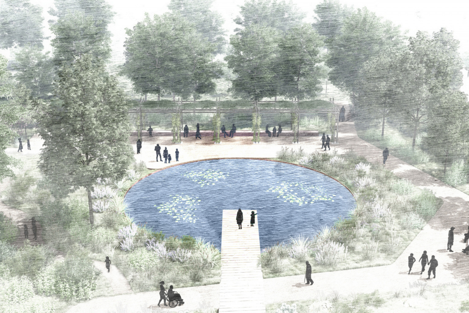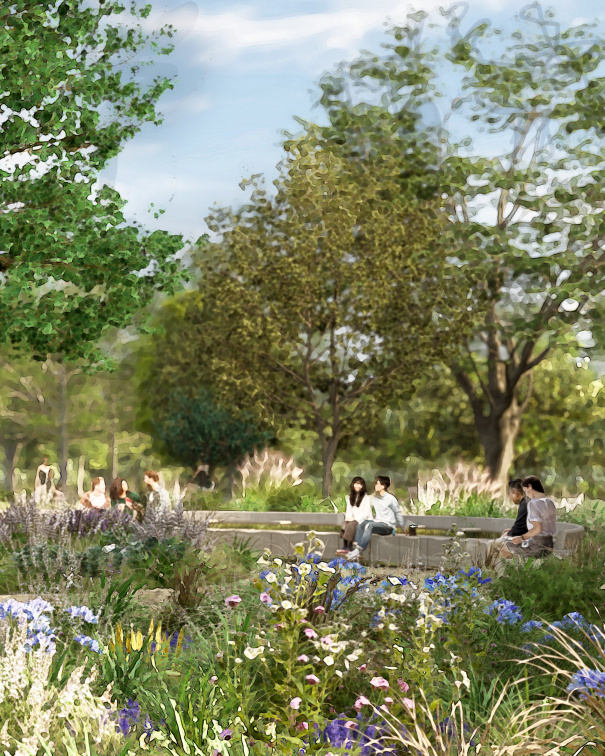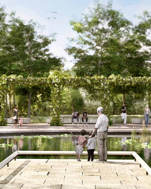 At the southern main entrance, visitors will be greeted by a large pond with seating and a pergola, creating a welcoming and serene entry point. The central promenade will be bisected by a meandering path which will lead the visitor through a series of beautiful landscapes. Additionally, a network of small-scale informal paths will allow visitors to wander through the planting and explore the garden further.