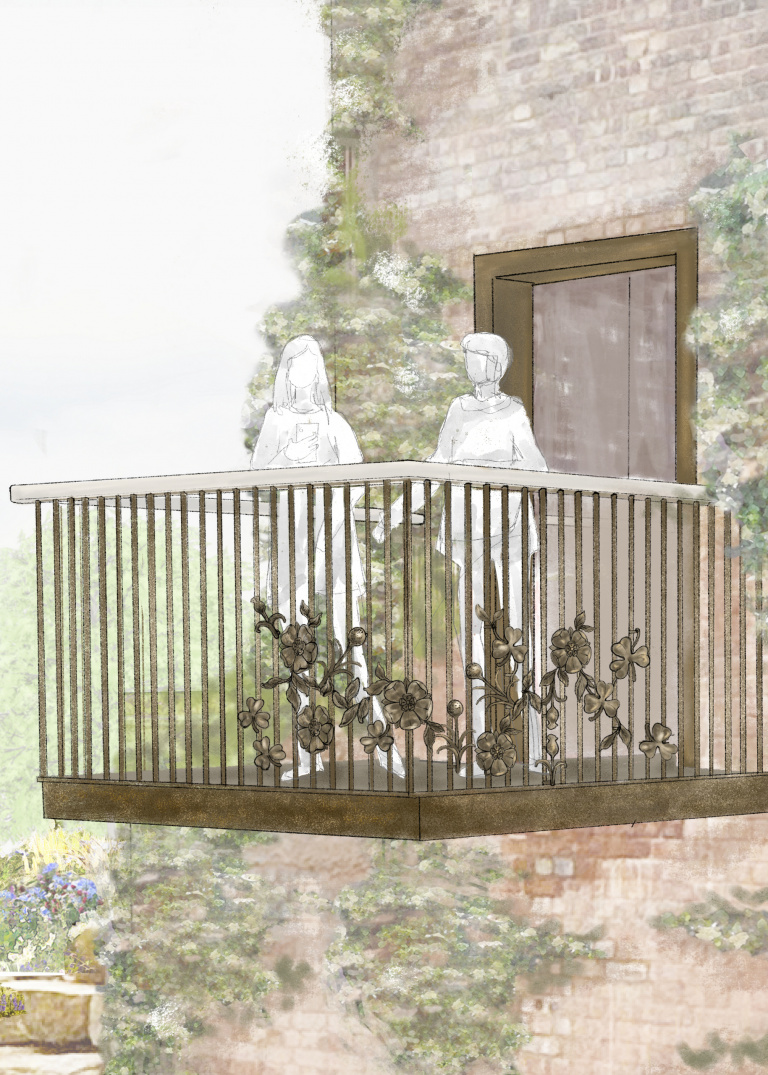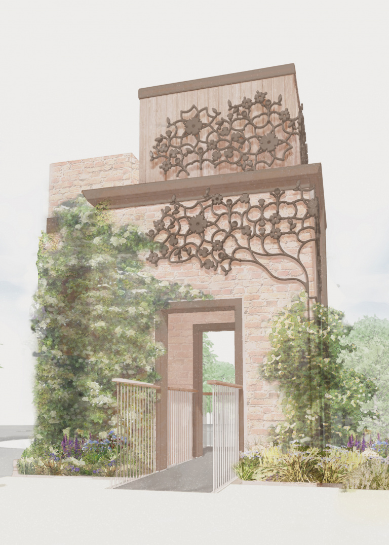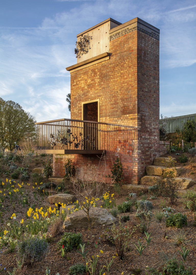 Decorative metalwork wraps around the re-imagined former water tower. It features decorative metalwork designed in collaboration with Ian Thackray, a traditional blacksmith and alumnus of The King’s Foundation. The metalwork symbolises the four home nations through motifs of thistle, leek, shamrock, and rose, as embroidered on the late Queen’s coronation gown, each individually forged by an artisan blacksmith from their respective nation.