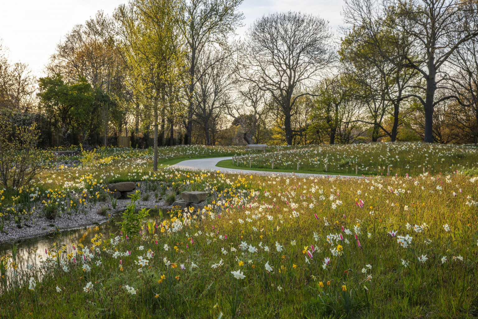 The flower garden seamlessly merges into ornamental meadows planted with large drifts of bulbs for an extended season and referencing the Queen’s Garden at Frogmore House and William Robinson’s Gravetye. The meadow is punctuated with occasional large scale specimen trees – oak and elm, representative of the English landscape.