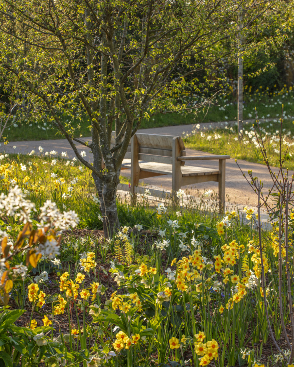 The roundel forms the heart of the garden and a tranquil place to pause within London’s busy city centre. A circular bench surrounds the roundel, gently framing the space in a protective embrace. The roundel’s focal point is a magnolia tree (Magnolia salicifolia ‘Wada’s Memory’), chosen to flower around Elizabeth II’s birthday. It is encircled with a quotation from the late Queen: