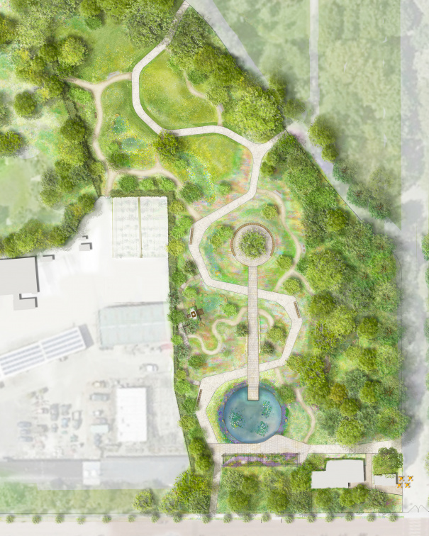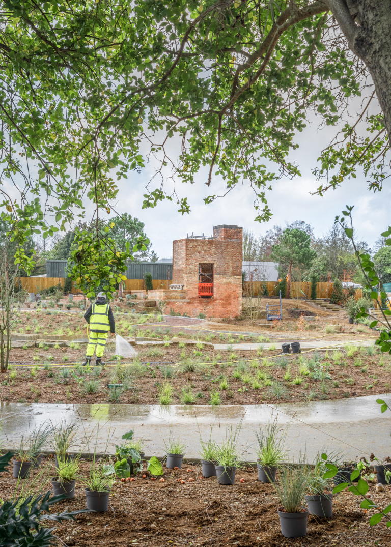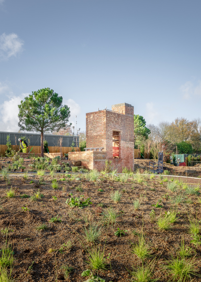 Existing woodland buffers have been enhanced with native understory planting, and a new western coppice softens views of the service yard. We carefully sculpted the landform to reuse site materials, creating diverse microclimates and gentle undulations. By burying the water tower’s basement, we created a prominent hill that offers elevated views, accessible via both stepped and winding paths.