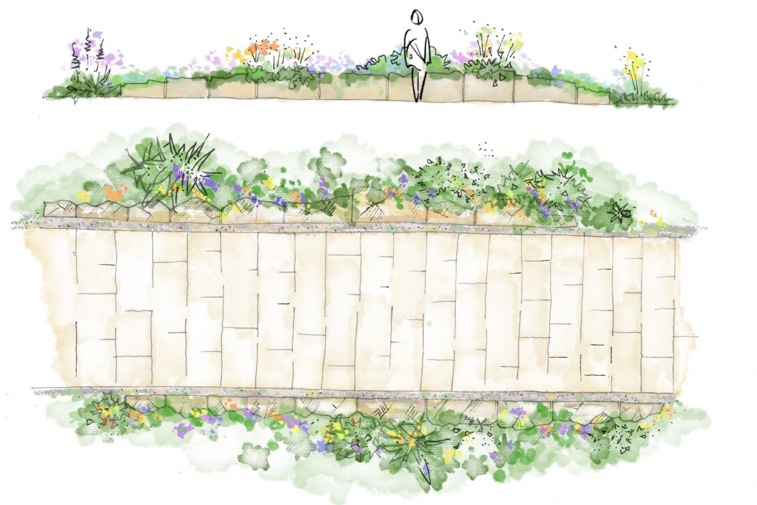 Stepping into the garden, visitors are greeted by planting on a grand scale. The centre is a mix of massed perennials, ornamental grasses and low woody shrubs. Tailored to the recycled aggregate growing mediums, it is forward looking and resilient to climate change.