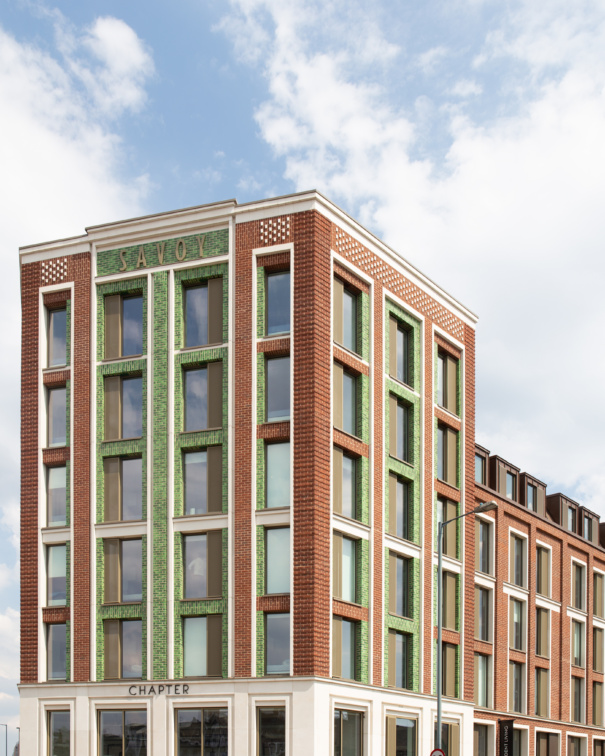 The construction of Savoy Circus, known as Chapter White City, is another addition to the series of student housing schemes designed by HTA and delivered by Vision Modular Systems. It sees the redevelopment of a site vacant for over 20 years with a contemporary building that sits sympathetically within a conservation area, with references to the famous cinema that once sat on the site. The building provides 306 student studios, social space, a cafe, administration and a gym on the ground floor. The basement contains laundry, bike storage and servicing, and a large common room opening onto a sheltered landscaped courtyard. Designed to optimise the benefits of the Vision Modular system, the project was delivered from concept to completion in 30 months, with work on site completed in 12 months.