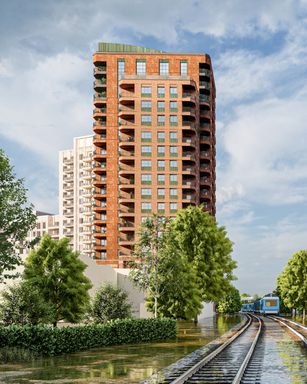 The building includes three floors dedicated to light industrial and commercial uses, with the residential component rising above to 18 storeys. Set-in shoulder elements help reduce the building’s bulk while maximizing dual aspects, allowing for more natural light and views. Additionally, podium terraces at various levels provide communal amenity spaces for residents and much-needed urban greening. These design strategies ensure that the development remains functional for industrial use while offering high-quality residential living spaces that encourage community interaction and sustainability.