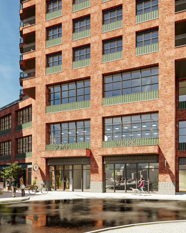 Soap Works incorporates design elements inspired by the ‘brick fields’ and ‘motor works’ factories, as well as the ‘soap suds’ launderettes that once served the theatres of the East End, reflecting the area’s industrial heritage. This is achieved using mottled brickwork, Crittall-style glazing, and terracotta panelling on the building’s façade. These materials and design elements pay homage to the site’s rich history while providing a modern and cohesive aesthetic that bridges the past and present.