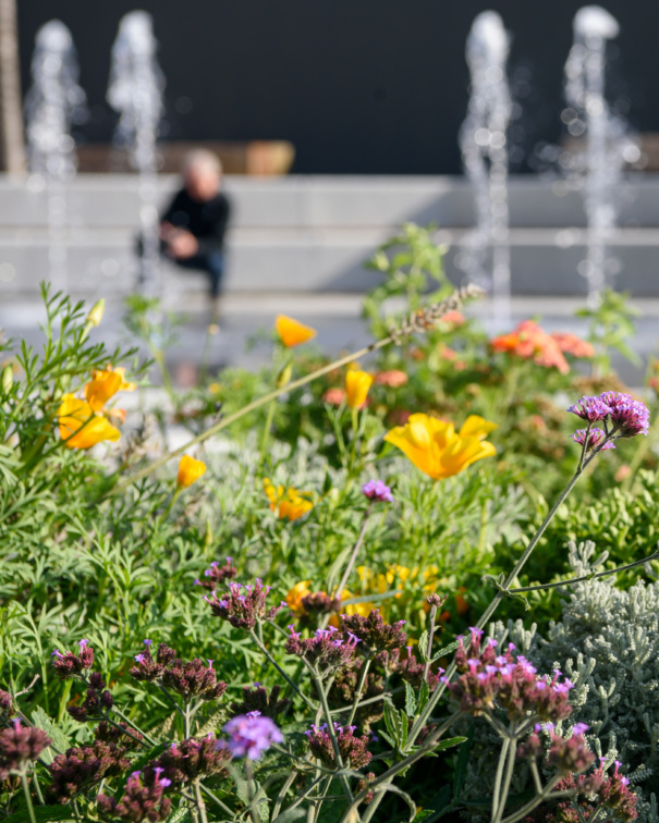 The second podium garden provides an open courtyard. Here a ring of trees has been designed to wrap around the space benefitting from a shared tree pit to allow a selection of native species to grown successfully on the roof top. The trees screen private gardens from the public space. Other ornamental species have also been selected for year-round interest and to encourage wildlife to these newly created outdoor spaces.