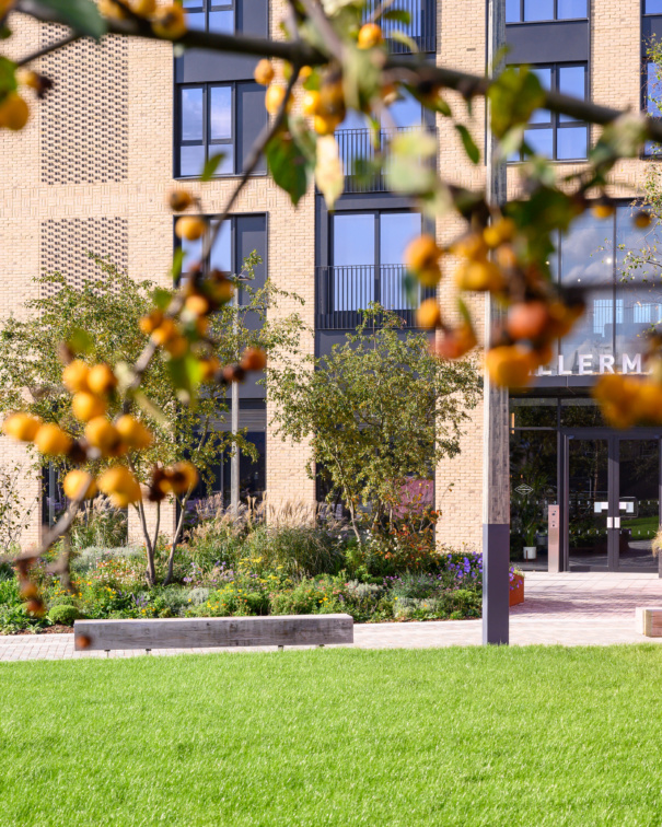 Three main landscaped spaces have been integrated into Tillermans. On the 14th floor an outdoor rooftop lounge has been furnished to allow people to take in views of Horsenden Hill.