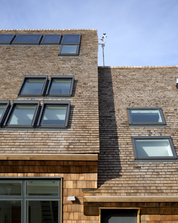 The external walls and the roof are both clad in timber shingles giving the building both individuality & simplicity. The warmth and renewable nature of timber shingles means that the environmental message is represented in the fabric of the home. The asymmetric design of the houses defines a strong frontage to the public realm while maximising light to the rear garden – allowing the occupants to enjoy a brighter space and to grow food on the micro-allotments.